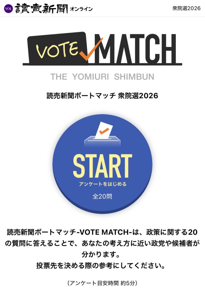 読売新聞ボートマッチ-VOTE MATCH-は、政党に関する20の質問に答えることで、あなたの考え方に近い政党や候補者が分かります。