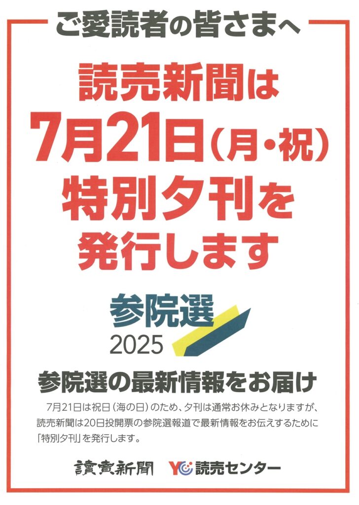 7月21日は祝日(海の日)のため、夕刊は通常お休みとなりますが、読売新聞は20日投開票の参院選報道で最新情報をお伝えするために「特別夕刊」を発行します。