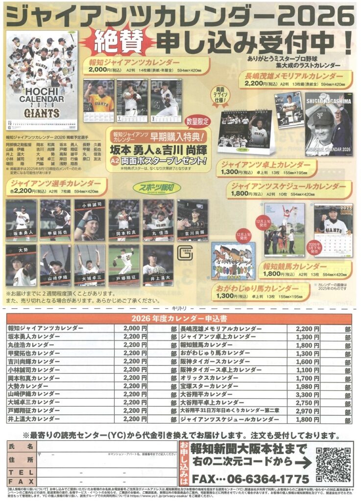 ジャイアンツカレンダー2026申込受付中!