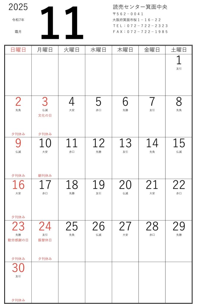 11月のカレンダー