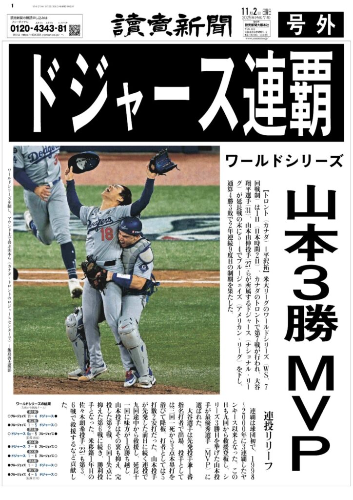 米大リーグのワールドシリーズ(WS,7回戦制)カナダのトロントで第7戦が行われ、大谷翔平選手(31)、山本由伸投手(27)らが所属するドジャースが延長戦の末に5-4でブルージェイズを下し、通算4勝3敗で2年連続9度目の制覇を果たした。