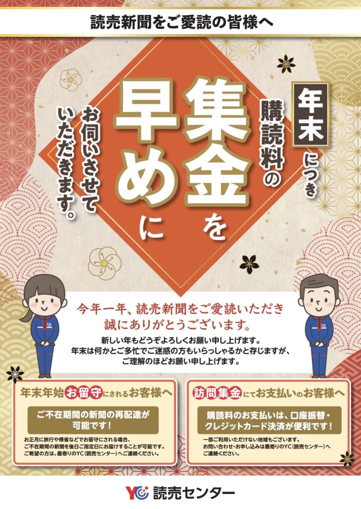 年末につき、購読料の集金を早めにお伺いさせていただきます。