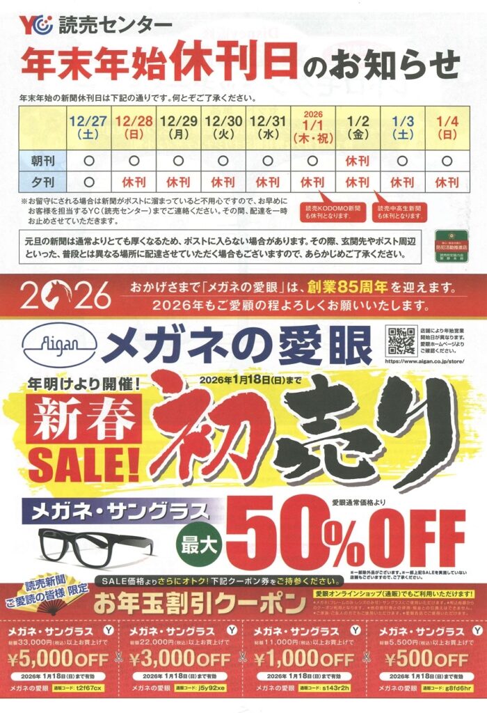 下記の通り、年末年始の新聞配達を休刊させていただきます。